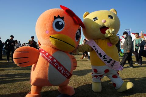 熊谷市の市民活動イメージキャラ「ニャオざね」と、岐阜県多治見市の「うながっぱ」のツーショット。